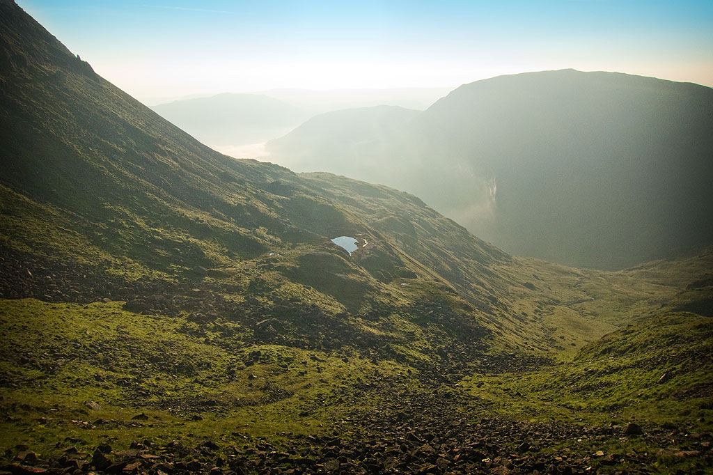 | After a longer, steeper and higher than anticipated walk (it had been a while since I had walked with a big back pack on!) – Hard Tarn appeared. It proved to be a perfect little spot to pitch a tent – with a bit of flat space that wasn’t boggy – and also some flat level rock face to sit on for when the grass is a little damp in the morning. It may not be the most accessible tarn in the area – but that can be considered a good thing – as then there is a good chance that you will get the space to yourself! |