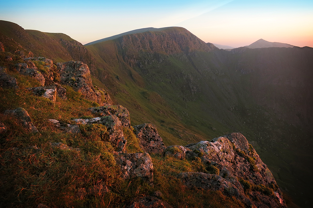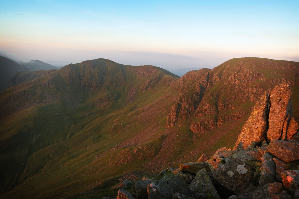 | A warm glow lighting up striding edge and the Helvellyn range |