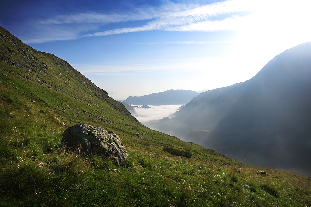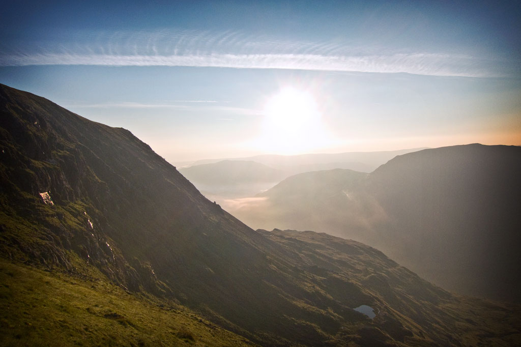![]() An amazing early morning sunrise view from the fells that you can only get on a wild camp! This is from Nethermost Pike looking east to Patterdale and the mist over Ullswater, with the Pennines in the far distance. |