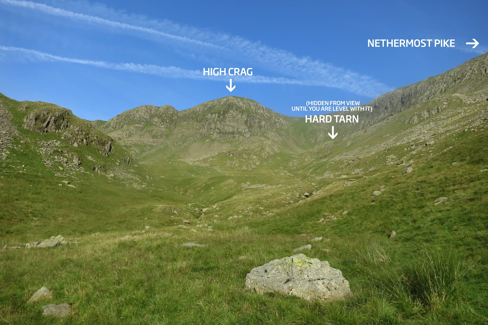 | The location of Hard Tarn using the surrounding mountain range as a guide. Keep High Cragg to your left – Nethermost Pike to your right – and follow the stream and you will get there, eventually 🙂 |