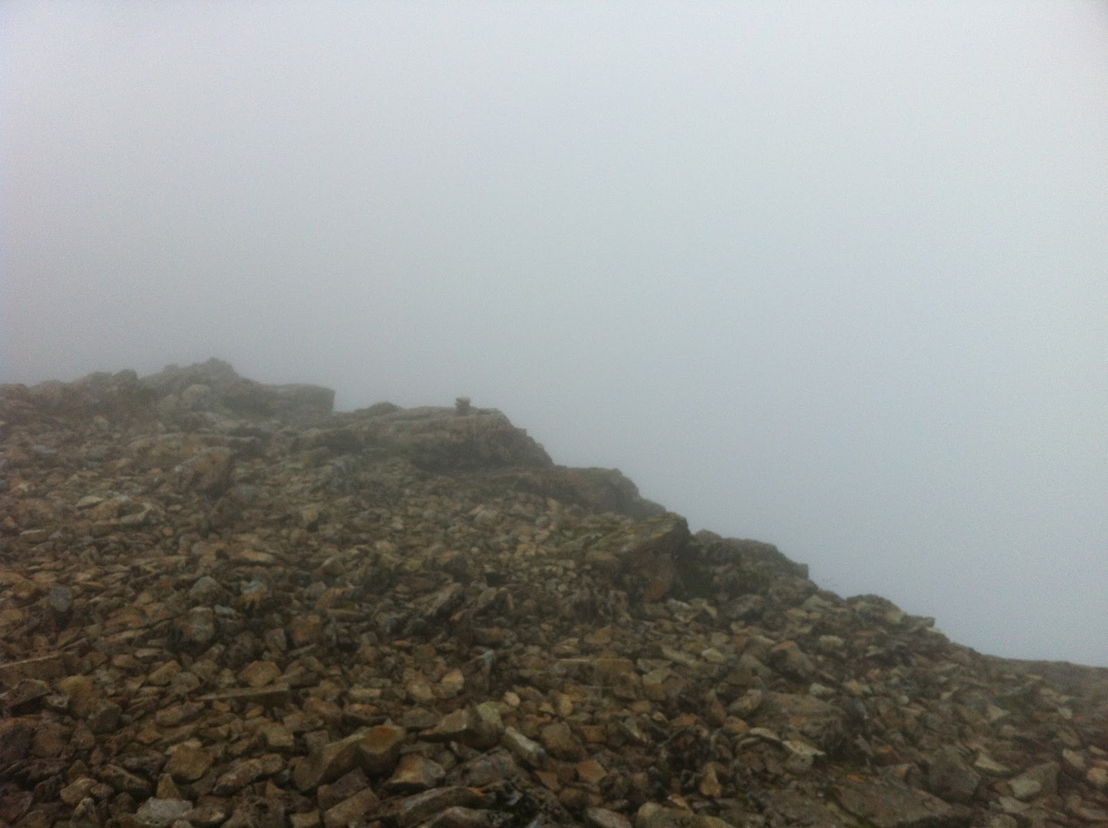 | This is what the summit actually looks like. It’s hard to imagine the steep drop from the summit when you can’t see 10 feet in front of you. |