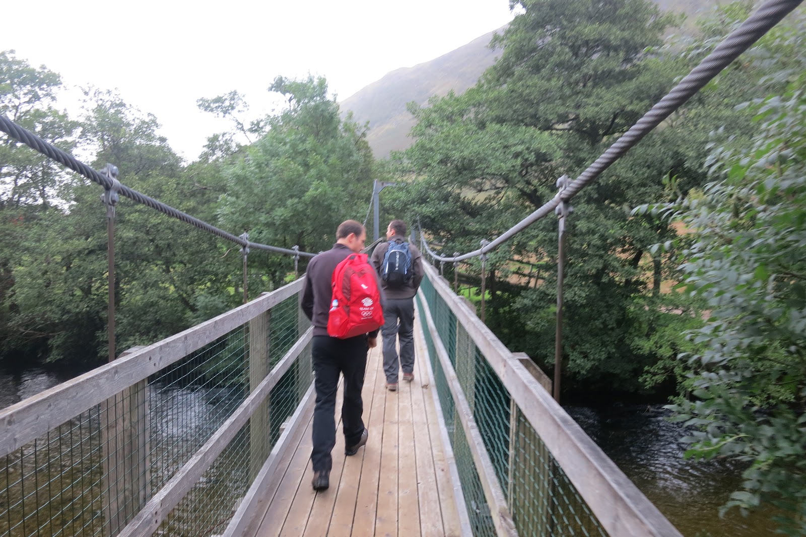 | Crossing the River Nevis over the suspension bridge from the car park to begin the route |