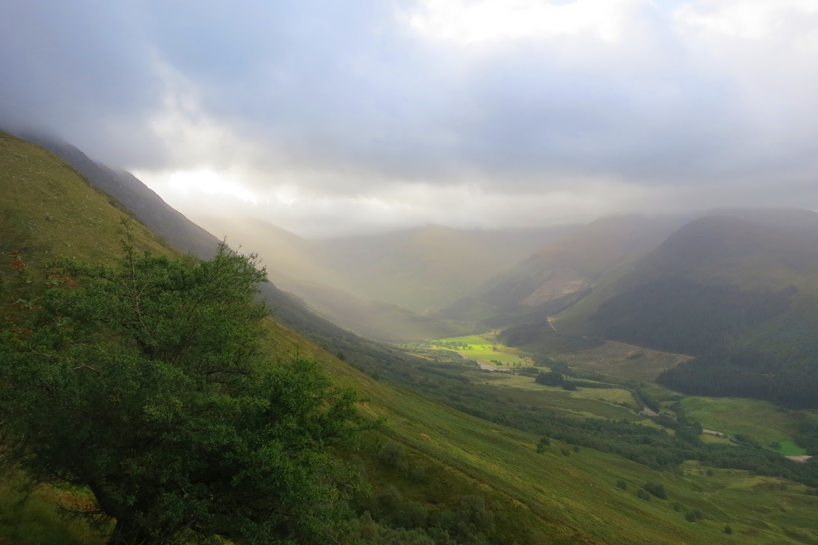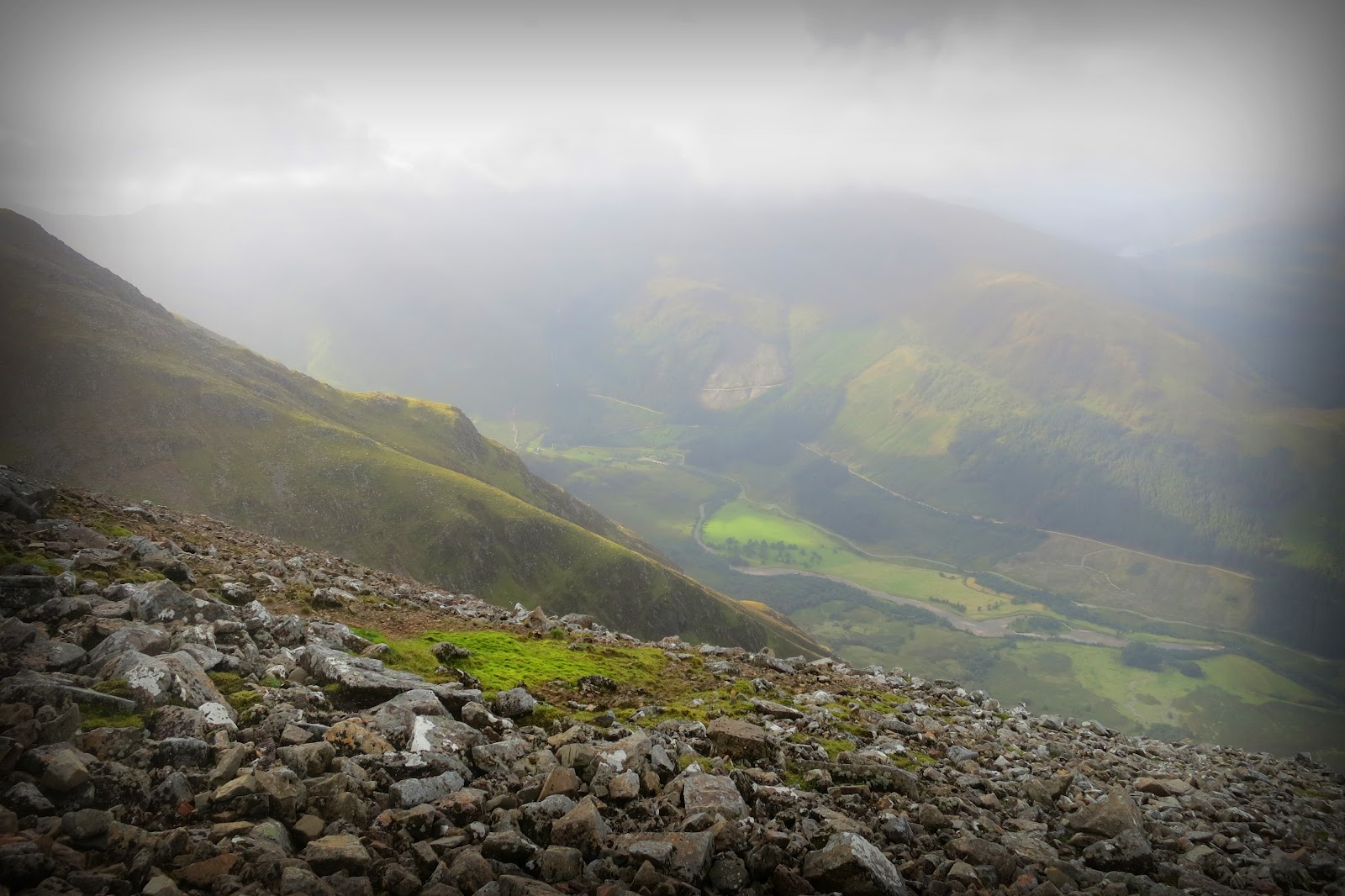 | Looking way back down to the Glen Nevis campsite, feeling quite high up now… |