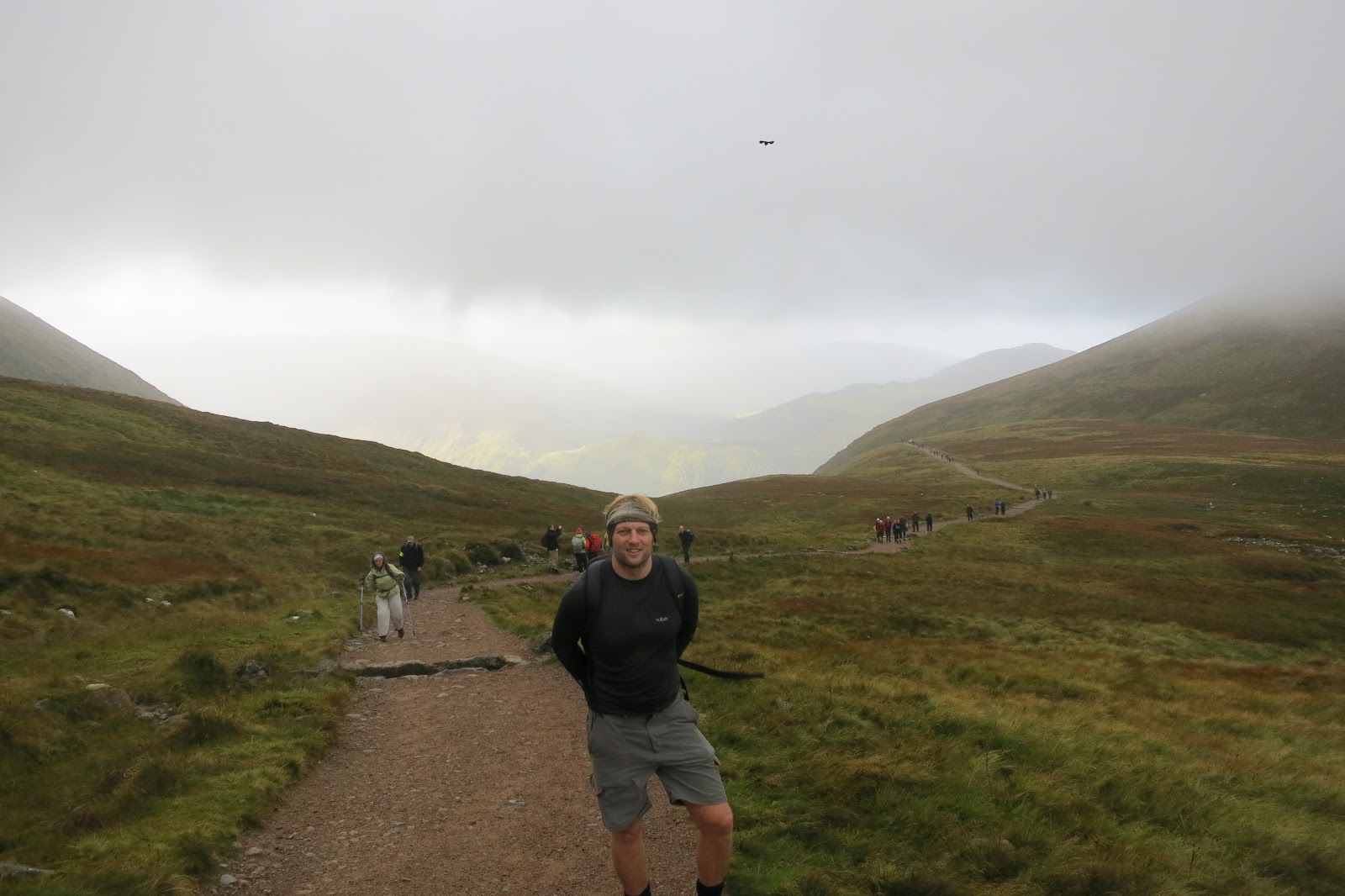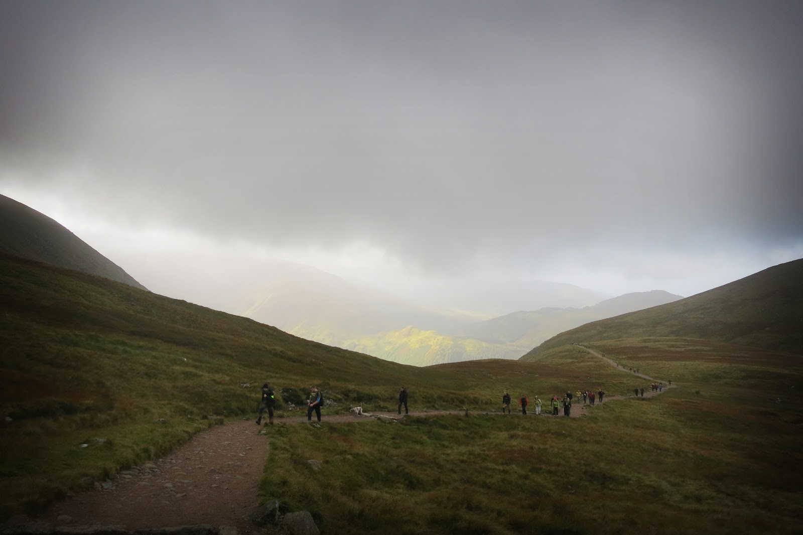 We arrived in Fort William on the friday tea-time – with drizzle in the air. After checking into Westcourt b&b which i would highly-recommend (see bottom of page)- we headed out into town for a bit to eat and a couple of pints (note, ‘couple’ – we didn’t want to feel too groggy the next day) so it was a case of an earlyish night on the friday – in preparation for the next days walk. We woke on the saturday to dry skies and a full scottish breakfast. Fortunately the days forecast was to remain dry – although the peaks would be covered in cloud. Slightly disappointing – although couldn’t complain really as it was bucketing down on the sunday – so we got the best day of weekend for the walk. I would love to come back and do the Ben on a clear day – but I read that on 9 out of 10 days you can’t see off the top of it……so got to be lucky with that one.