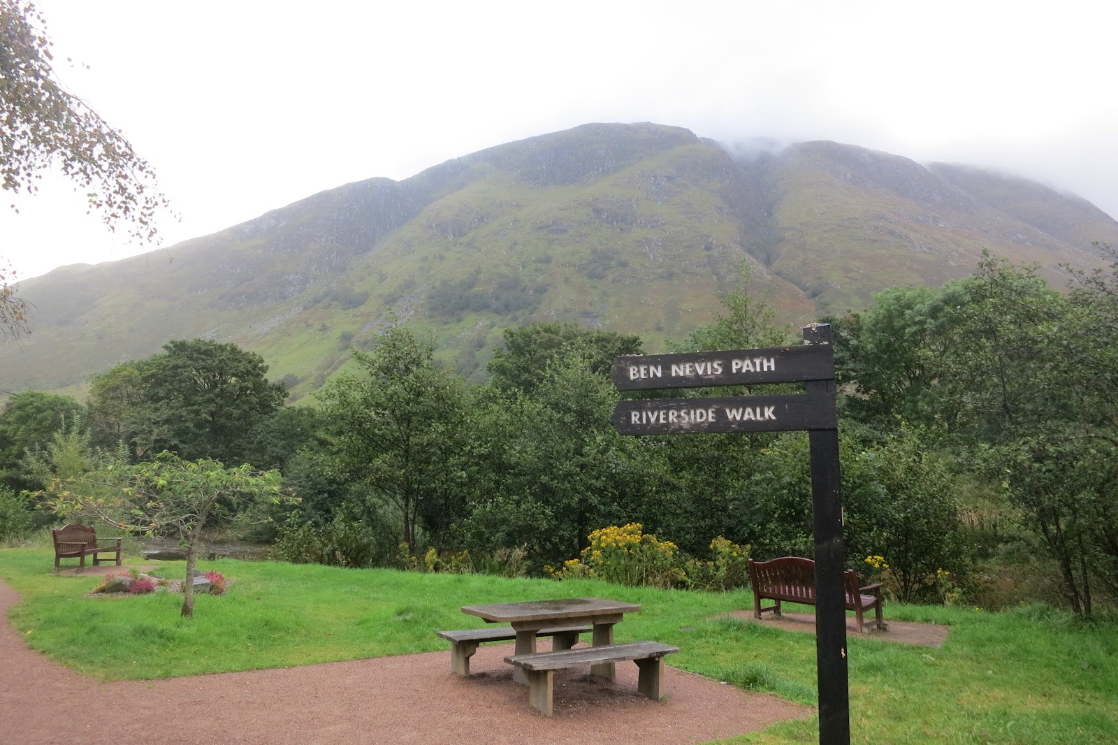 | Start of the Ben Nevis walk from the Glen Nevis visitors centre, peaks covered in cloud 🙁 It costs £3 to park in the car park all day – and I would recommend it – as we didn’t fancy walking much further than the car park at the end of the Ben walk 🙂 |