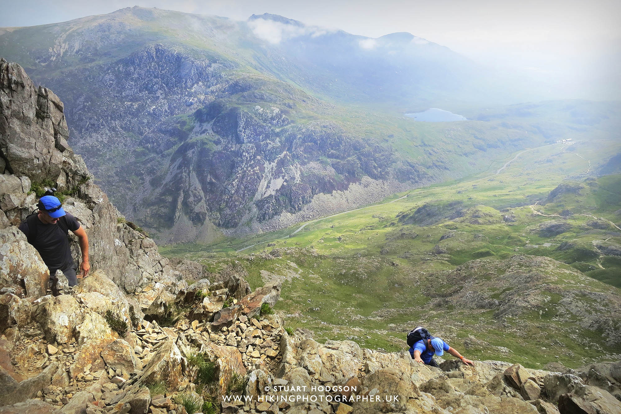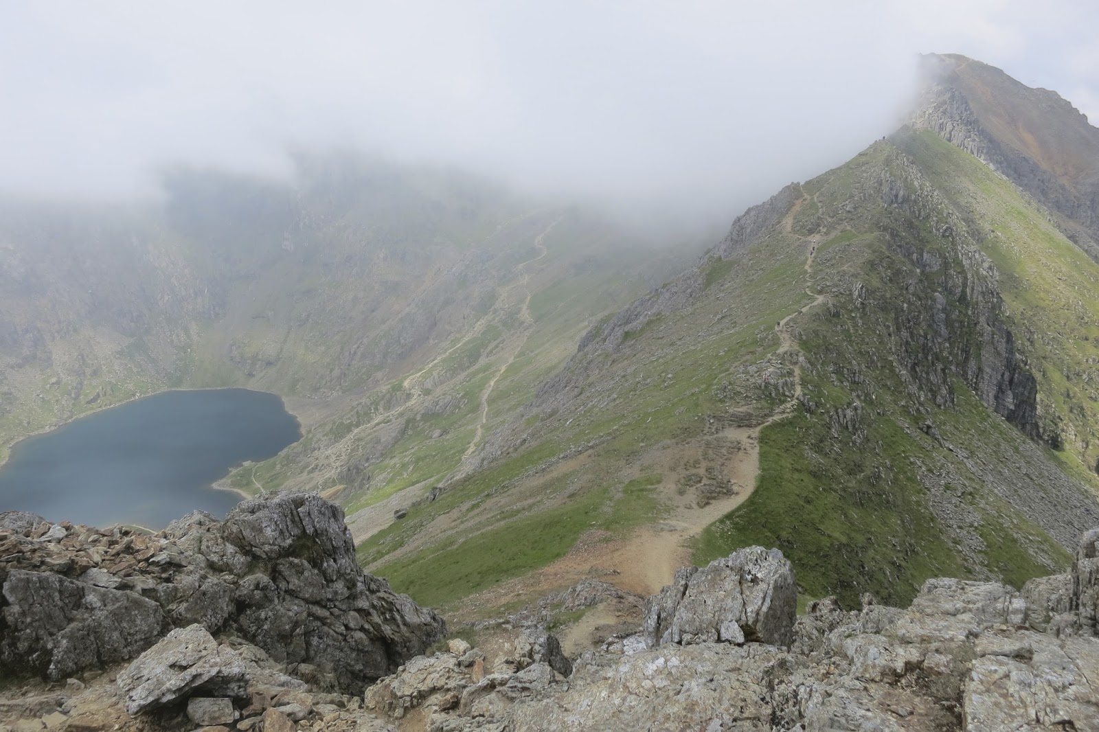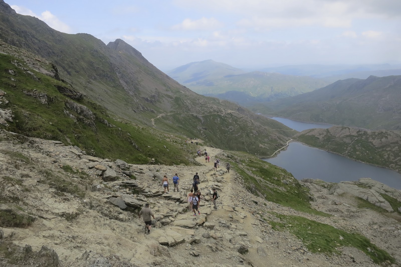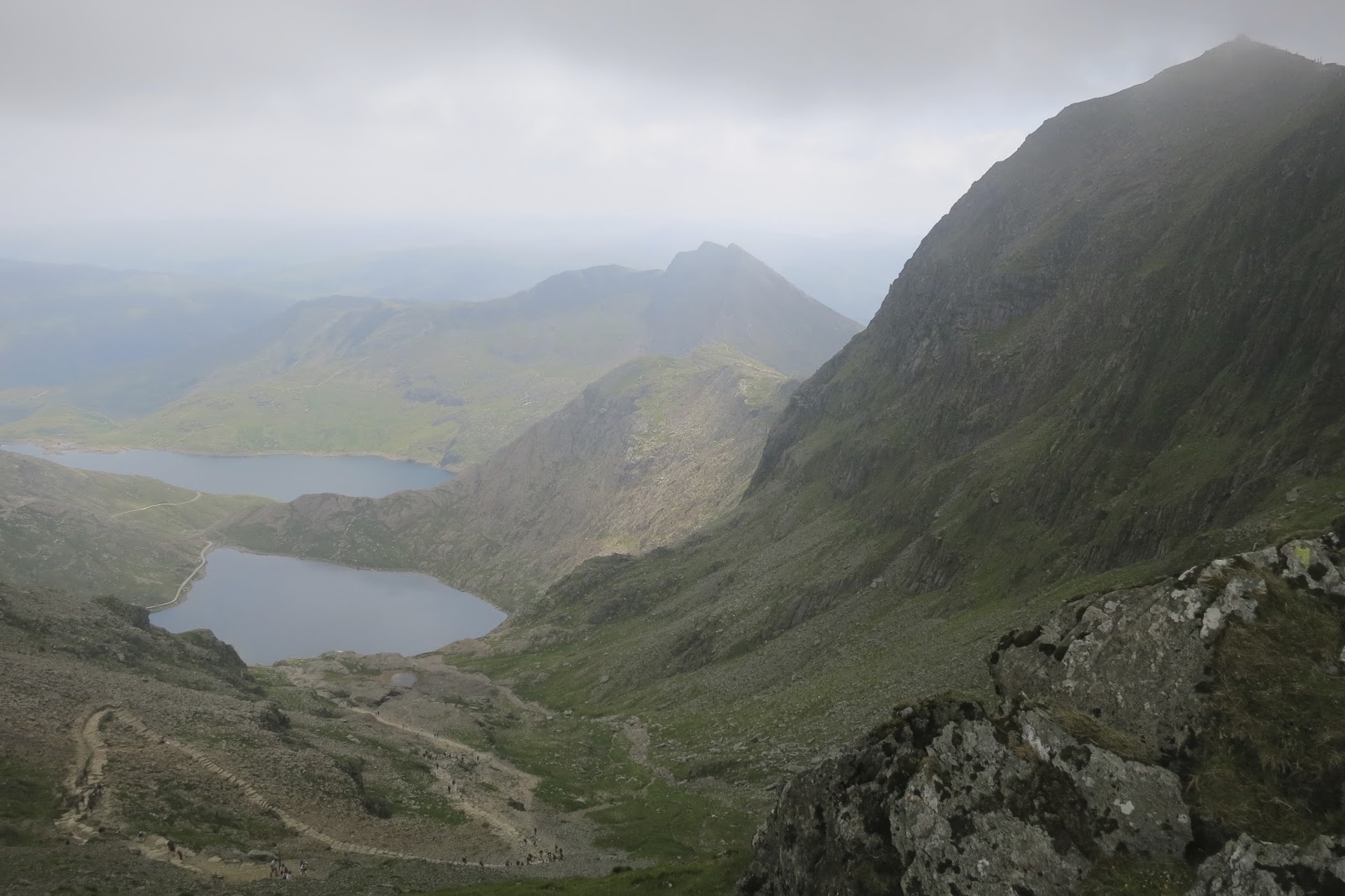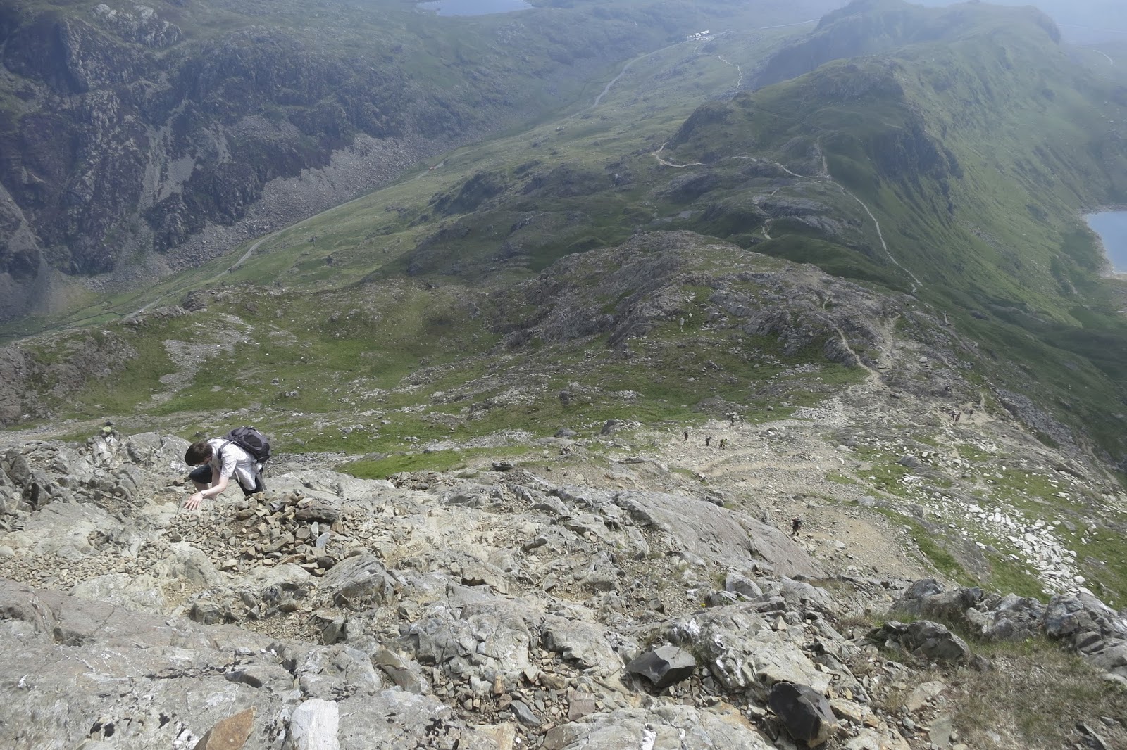 | Looking down towards the Pyg Track & miners Track with Crib Goch to the left (we’ll later come back down this way) |