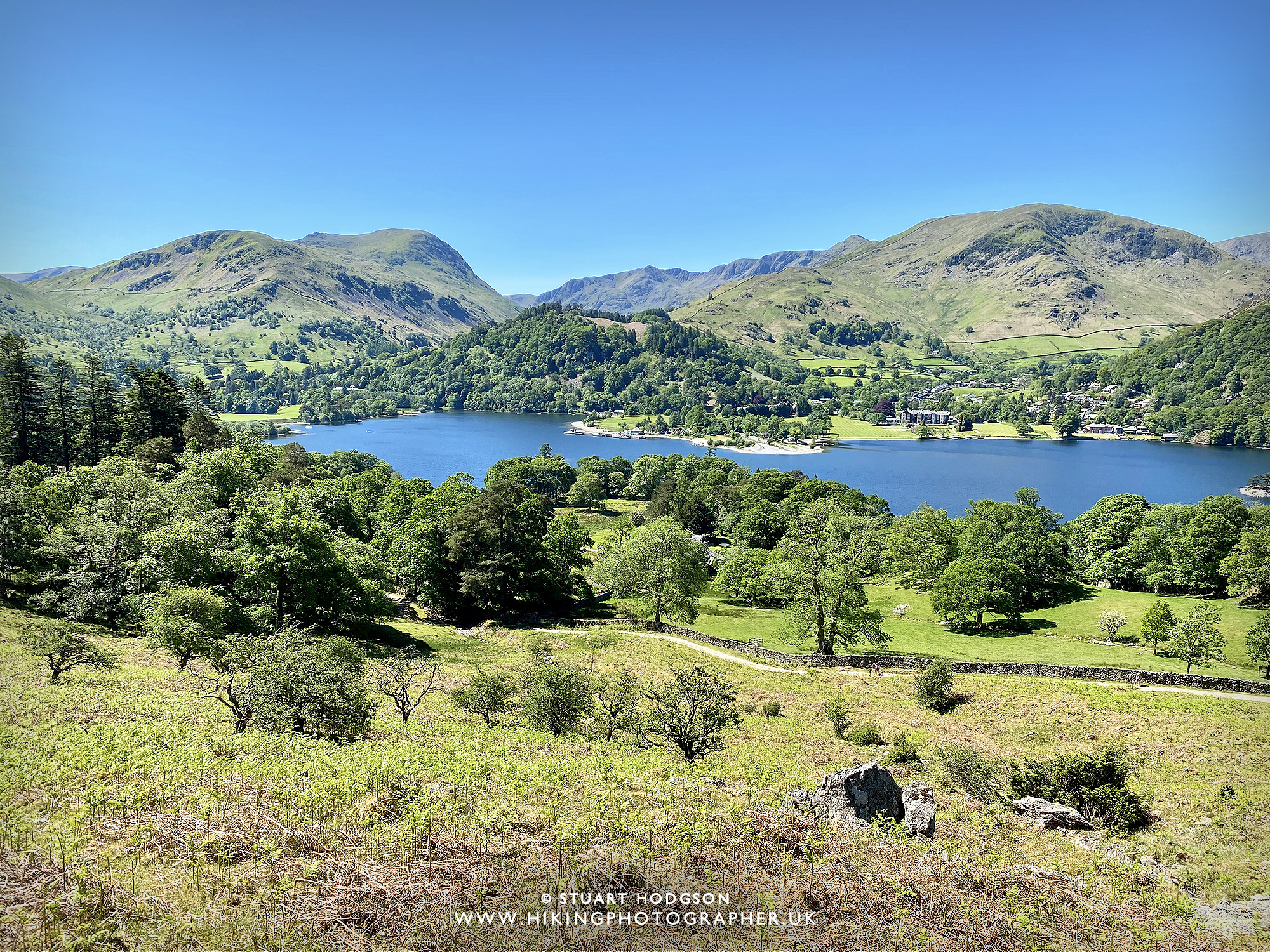 | With the temperature approaching 22˙C on this day it was tempting to take a dip in the lake – but we head up the path between Silver Crag & Birk Fell to gain a little height as the views of the lake will be better further ahead. Some people decide to stick to the path by the lake shore which is a little easier – but I think you get better views of Ullswater this way |