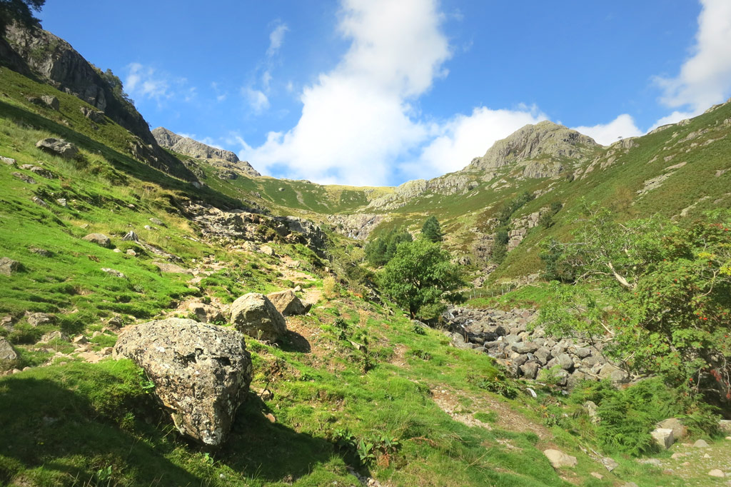| The first section of the walk heads up alongside Stickle Ghyll to Stickle Tarn |