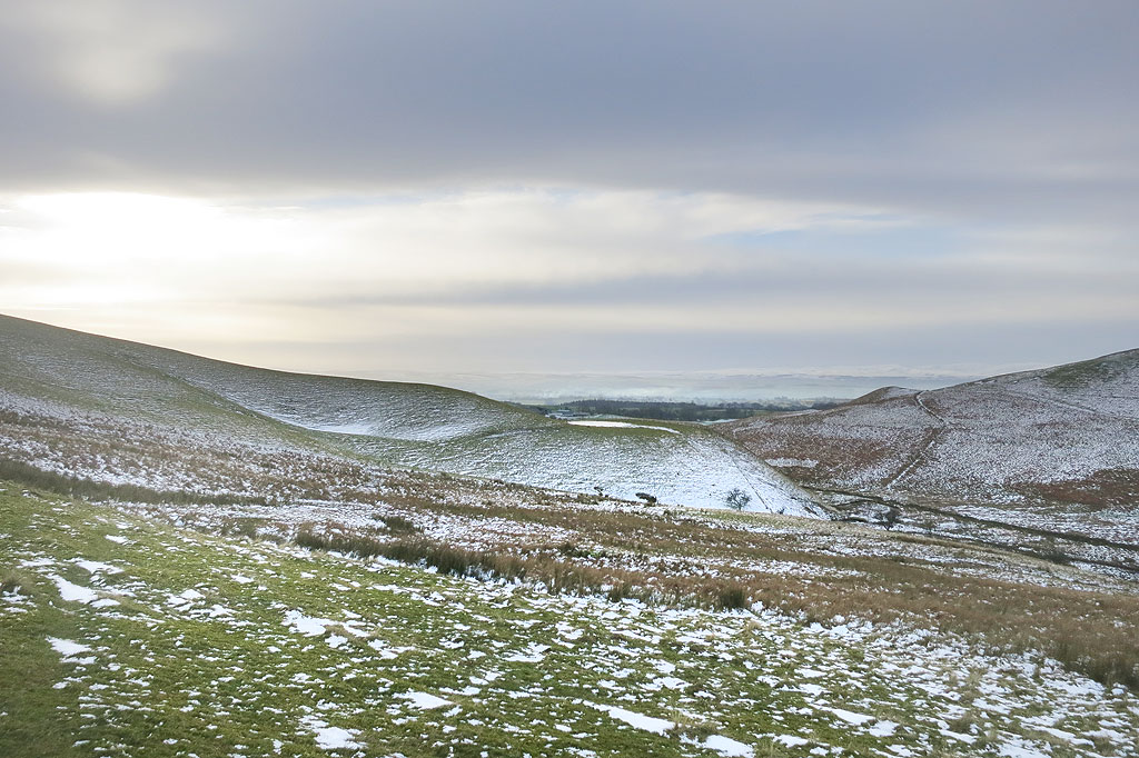 | The initial part of the walk is a gentle walk uphill along the clearly marked Pennine Way. You can just see Bow Hall in this pic – the skies are a little grey – even though the forecast said there would be bursts of sunshine. There is no wind whatsoever – and it’s about -3ºC – so fresh! |