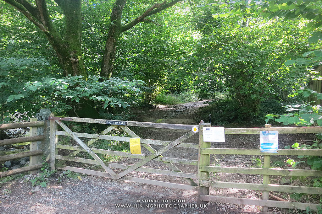 When walking through Springs Wood – make sure you take the path that leads off to Walla Crag (signposted right in this photo) otherwise you will end up at the demolished bridge! |