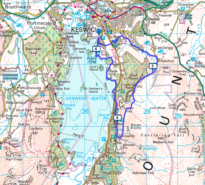 Map of the full walking route from Keswick to Ashness Bridge via Walla Crag