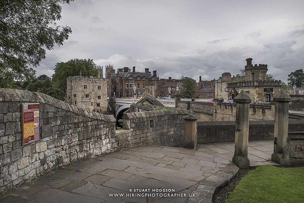 Now we are approaching the end of the opportunity to walk along the city walls at North Street Postern before we get to the River Ouse again. You can see Barker Tower to the right and Lendal Tower at the other end of the bridge. Once over the bridge you can go and get a well deserved drink in one of the many coffee shops and pubs/bars – or enter the Museum Gardens near where you started the walk and take a look at the Multangular Tower.