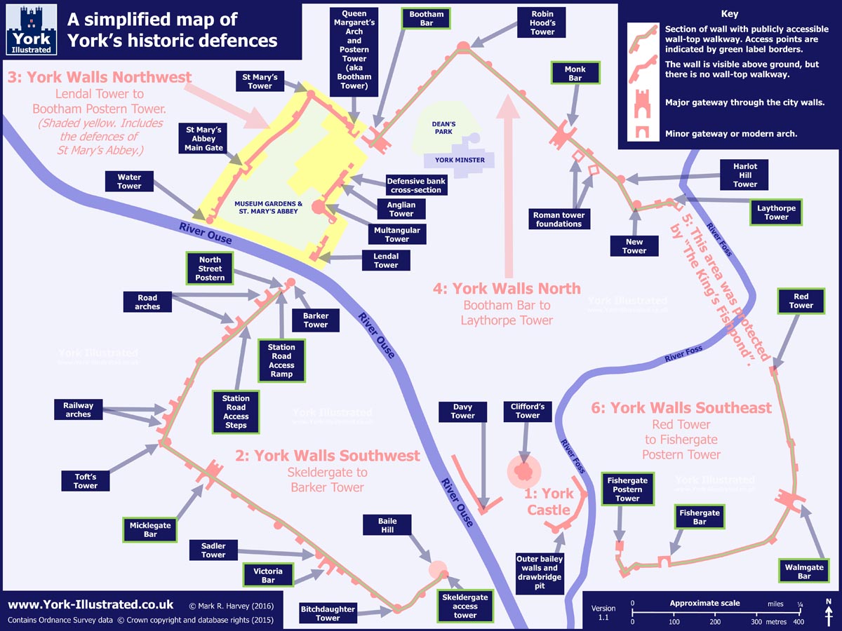 | [Click to enlarge] This map clearly shows all the particular defences and gatehouses along the York City Walls and I will cross-reference where I can in my photos below |