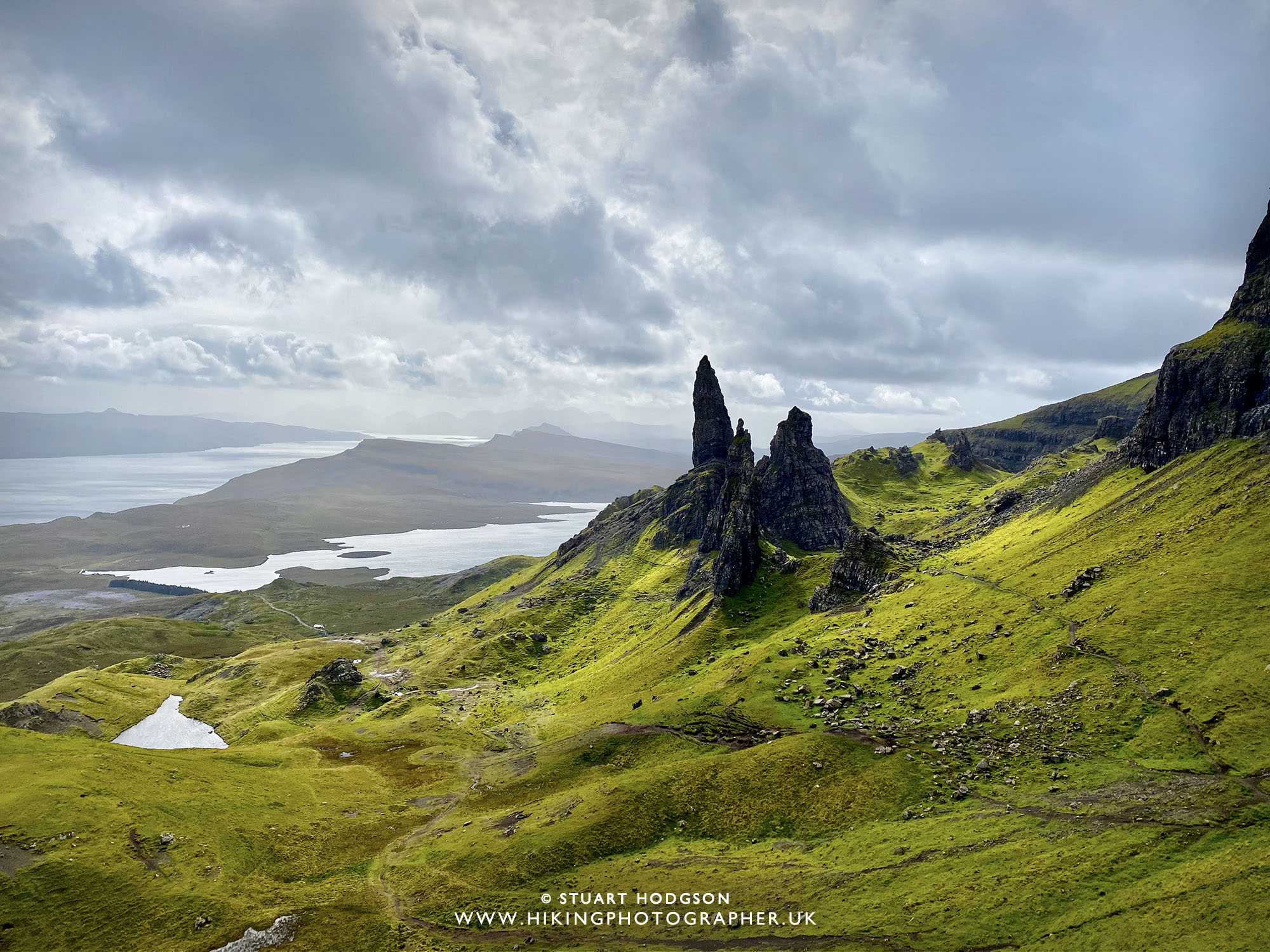 | Simply stunning views of the Old Man of Storr with Loch Leathan to the left in the distance and the Sound of Rassay to the far left.  |