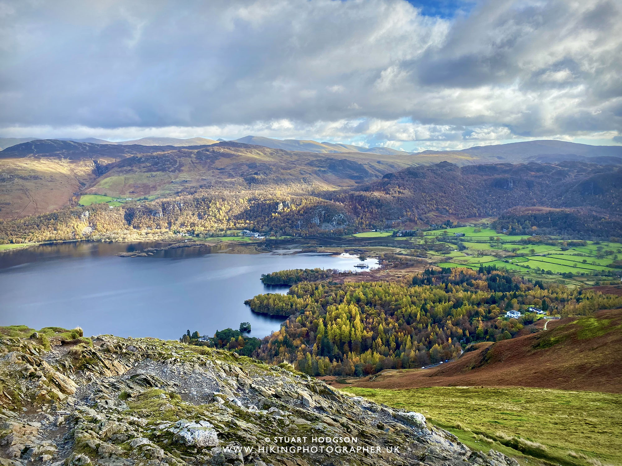 If we look east from the summit we look over towards Ashness Bridge and Lodore Falls hotel – where the trees give it a very autumnal feel |