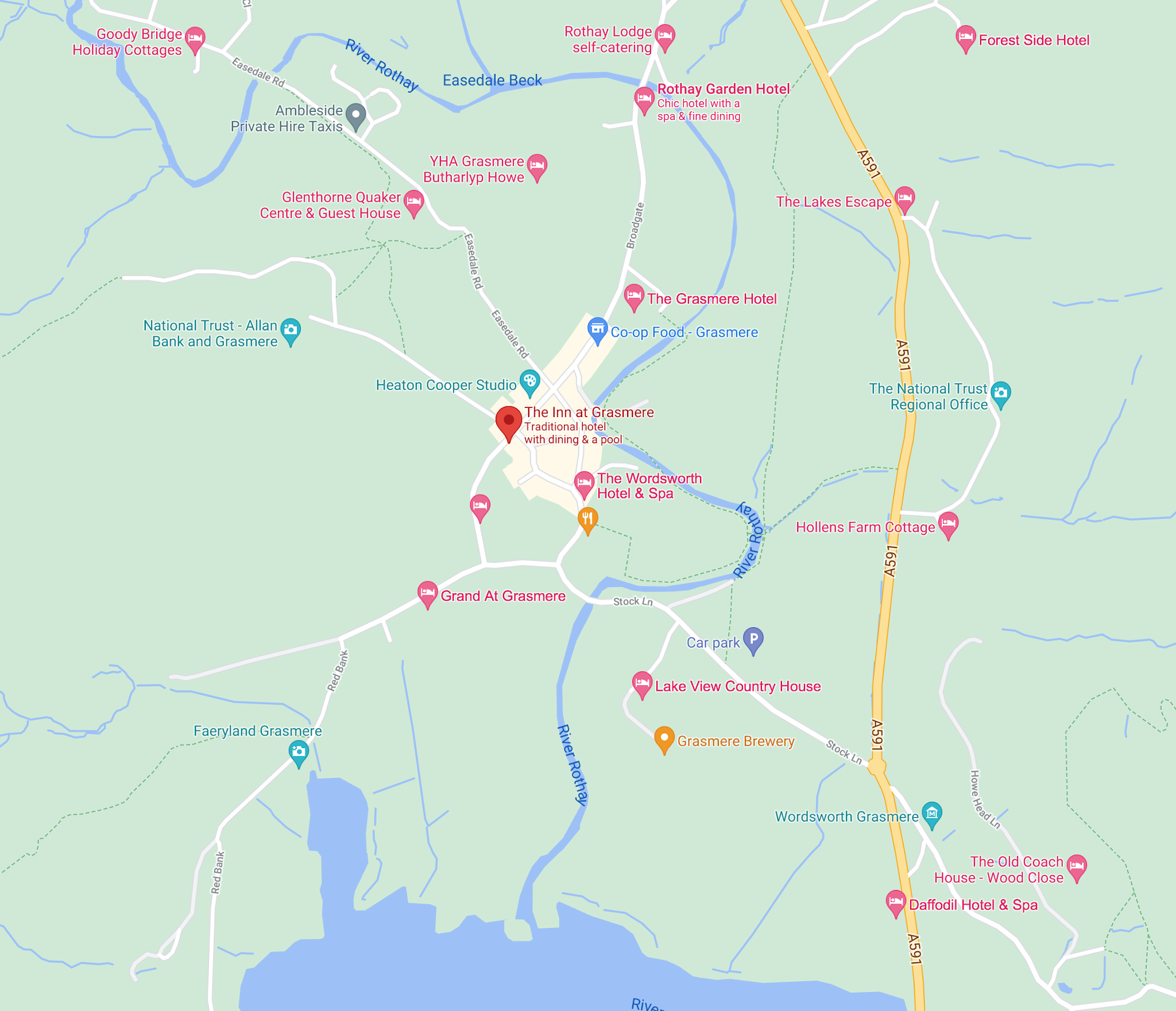 Here you can see the location of The Inn at Grasmere – which is smack bang in the middle of Grasmere village – so everything was a very short walk away – ideal when you don’t want to drive the car. The hotel also offered free parking right out the front of the Hotel – which was a very welcome bonus as free parking in Grasmere for visitors is non-existent (Although there are large pay and display car parks a 5/10 minute walk away from the hotel). |